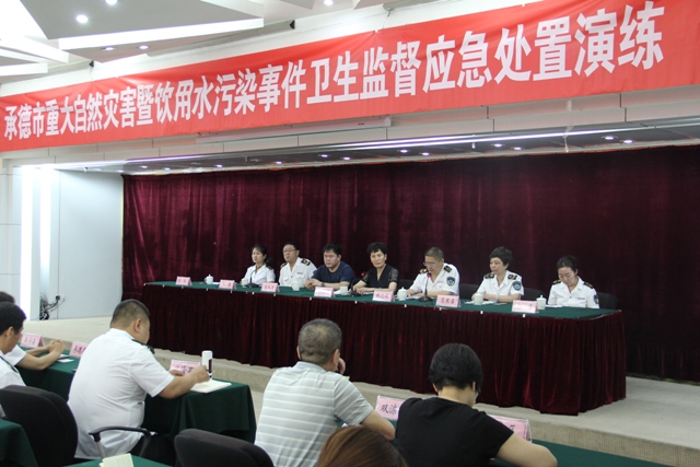 为提升承德市各级卫生监督执法机构处置突发饮用水污染事件的快速反应和应急处置能力,确保承德市饮用水卫生安全,7月6日上午,在市卫计委的统一部署下,承德市各县、区12支演练队伍在承德市锦江文冠饭店参加2017年重大自然灾害暨饮用水污染事件卫生应急处置演练。