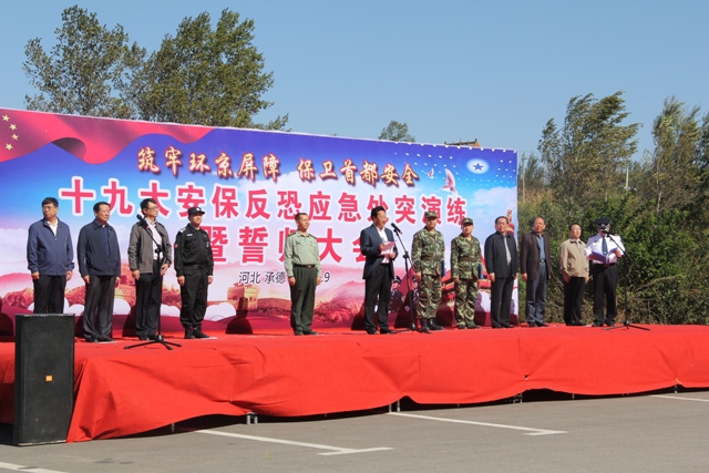 即将召开的党的“十九大”,是全党全国人民政治生活中的一件大事,举世瞩目、世界关注。为加强反恐工作,保障“十九大”期间社会稳定,9月28日,在承德市外环路罄锤峰举行全市“十九大安保反恐应急处突演练暨誓师大会”。来自14个单位的200人反恐应急处突演练队伍集结完毕后,在现场指挥员的领誓下,面向党旗宣誓,坚决打赢党的十九大安保战役。这标志着全市党的十九大安保工作正式进入决战决胜阶段。在演练中,我局反恐小组接到指挥中心指令后,立即出动,车辆2辆,应急队员8人,携带执法文书、取证器材、现场快速检测设备,由张沈承局长带领第一时间快速集结到位,充分展示了我们卫生监督人的斗志、精湛的技能和顽强的工作作风。