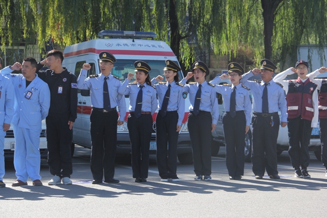 即将召开的党的“十九大”,是全党全国人民政治生活中的一件大事,举世瞩目、世界关注。为加强反恐工作,保障“十九大”期间社会稳定,9月28日,在承德市外环路罄锤峰举行全市“十九大安保反恐应急处突演练暨誓师大会”。来自14个单位的200人反恐应急处突演练队伍集结完毕后,在现场指挥员的领誓下,面向党旗宣誓,坚决打赢党的十九大安保战役。这标志着全市党的十九大安保工作正式进入决战决胜阶段。在演练中,我局反恐小组接到指挥中心指令后,立即出动,车辆2辆,应急队员8人,携带执法文书、取证器材、现场快速检测设备,由张沈承局长带领第一时间快速集结到位,充分展示了我们卫生监督人的斗志、精湛的技能和顽强的工作作风。